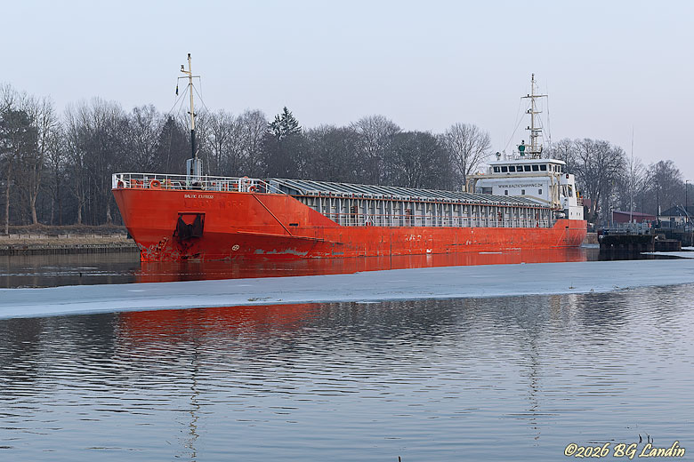 Lastfartyget Baltic Express har slussat klart i Brinkebergskulle och fortsätter genom den grävda kanalen Karls grav. Karls grav förbinder Göta älv i väster med vänerviken Vassbotten i öster och gör så fartyg till Vänern kan undvika forsen i Önafors. Det orange skrovet på Baltic Express är ett intensivt färginslag i en annars ganska gråtrist marsdag. Baltic Express har i ett tidigare liv gått under namnet Lady Nora, vilket framgår av dom upphöjda men övermålade bokstäverna i fören. Fartyg byter namn lite titt som tätt beroende på att dom också byter ägare lite titt som tätt. Fartyget är på väg till vänerhamnen Lidköping och ligger relativt högt i vattnet. Baltic Express hör hemma i det exotiska Saint Kitts och Nevis i Karibien och har bytt det betydligt varmare klimatet där mot det mer kylslagna nordiska. Här finns fler bilder på sjöfart.