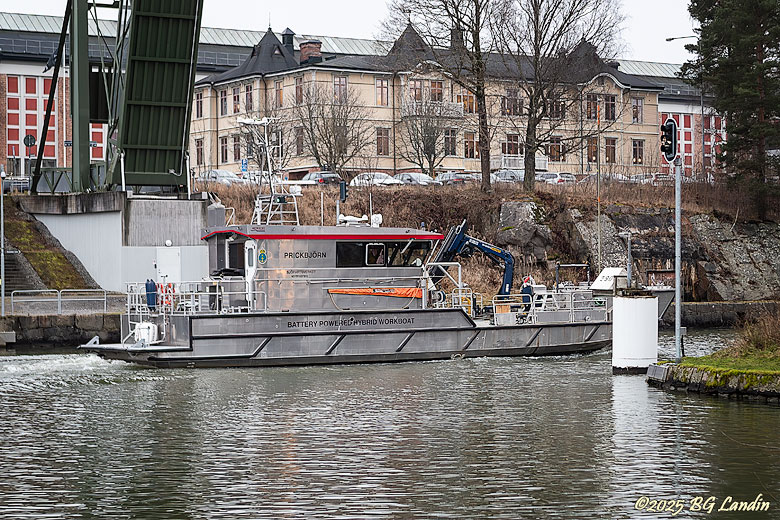 Sjöfartsverkets batteribåt Prickbjörn är på väg tillbaka till sin hemmahamn i Trollhättan efter ett uppdrag. Prickbjörn håller precis på att passera gång- och cykelbron Olidebron och har bara några hundra meter kvar innan den kan lägga till vid sin hemmahamn. Prickbjörn levererades till Sjöfartsverket 2021 och var med sin kombinerade batteri- och dieseldrift unik. Batteribåten ingår i projektet Fossilfri flotta och har fått batterikapaciteten fördubblad jämfört med vid leveransen. Batterierna kan laddas via landkabel eller via den pålitliga dieselmotorn ombord. Man pratar dock ganska tyst om att för att ladda batterierna under drift fungerar inget annat än traditionellt bränsle i form av diesel. Laddningen via landkabel kan heller inte alltid ske utan traditionellt alstrad elkraft. Här finns fler bilder på sjöfart.