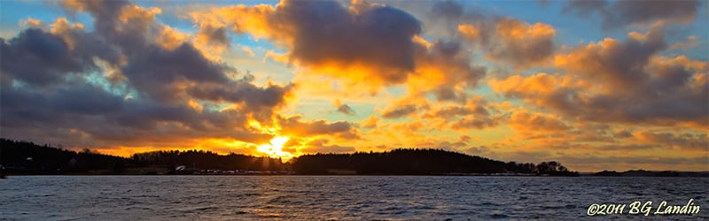 Klockan är några minuter i fyra en dag i början av december och det dröjer inte många minuter innan solen helt försvinner ner under träden vid Lövekulle. Under dagen har solen stundtals tittat fram genom gluggar i molnen och så här i sista stund letar sig solen fram genom några öppningar, som skapar var sina ljusmattor över både skogen och Mjörns lite oroliga vattnet. Himlen är fortfarande blå där molnen inte skymmer, trots att solen strax försvinner ner under horisonten. Det vita man ser rakt under solstrålarna är de upptagna båtarna vid Alfhem och längre till höger i bilden kan man skymta de husvagnar som fortfarande står kvar vid Lövekulle camping. Här finns fler blandade bilder.