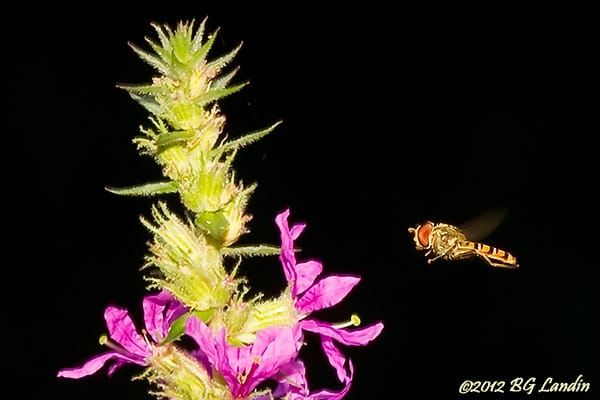 Hundarna fick komma ut på en promenad längs Säveån vid Häradsvads bro, där man tror att slaget mellan Birger Jarl och folkungarna stod år 1251. Vid promenaden längs Säveån hittade vi ett fint ställe att ta en paus på och hundarna passade på att bada och gnaga på pinnar. Samtidigt kunde tvåbeningen packa upp kameran och sätta på makroobjektivet. Vid strandkanten stod flera rödlila fackelblomster, som drog till sig min uppmärksamhet. Blixten monterades på kameran för att kunna frilägga blomman från bakgrunden och jag tog några bilder. Plötsligt upptäcker jag den lilla flygaren som är ivrigt intresserad av blomman och rätt som det var sitter bilden där. Dom stora rödglänsande fasettögonen på huvudet fokuserar på blomman och dom snabba vingslagen framträder på grund av den relativt långa exponeringstiden. Här finns fler bilder på djur och natur.