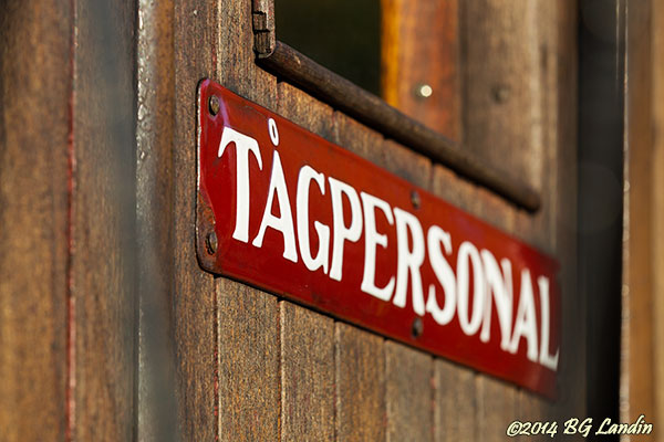 Den röda emaljskylten är tydlig med sitt budskap att här får bara tågpersonal vistas. På de äldre passagerarvagnarna fanns ofta ett avgränsat utrymme i den ena ändan som var avsett för tågpersonalen. In till passagerarna fanns en låst dörr och från utsidan kunde man nå utrymmet från den ena påstigningsrampen. I personalutrymmet kunde konduktören utföra en del enklare sysslor under resans gång eller till och med sitta ner en stund och ta igen sig i den mån det fanns tid över för sådant under resan. Möjligheten för konduktören att ta sig över till ångloket var i princip obefintlig under resans gång då det fanns en kolvagn mellan loket och passagerarvagnarna, som man inte tog sig över utan att riskera både liv och lem. Här finns fler bilder från Anten Gräfsnäs Järnväg.