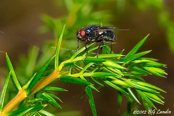 Flugan har tillfälligt landat bland dom förföriskt gröna barren på den unga enbusken. Man kan se några trådar från en spindel, som påbörjat sitt nät mellan några barr i vänsterkanten på bilden. Vad flugans stora röda fasettögon har ställt in siktet på är osäkert men det verkar som den inte är nämnvärt störd av min fotografering trots att det blixtar upprepade gånger. På ryggen av flugan kan man se några av dom fina hår som täcker kroppen och insektens sex ben är stadigt förankrade bland enbarren. Flugorna är ofta betydligt mindre irriterande än dom andra tvåvingarna, som myggor och knott. Bilden togs med manuell exponering och med blixten som huvudljus direktmonterad på kameran. Här finns fler bilder på djur och natur.