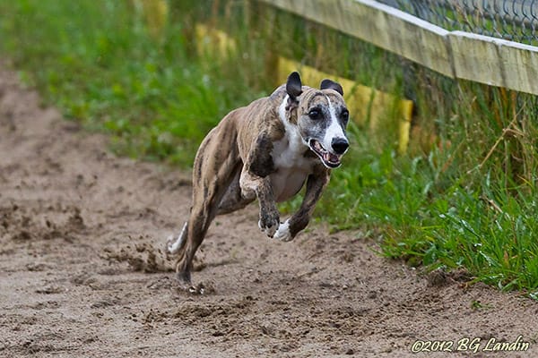 En whippet med fullt fokus på att hinna ifatt haren rusar fram på hundkapplöpningsbanan vid Mariedal en småregning träningstisdag början av september. Trots det lite dystra vädret är de fullt med entusiastiska förare och minst lika entusiastiska hundar, som väntar på att få springa allt vad tygen håller. Dom här racinghundarna fullkomligt älskar att springa på banan och när dom går utanför banan med sin förare på väg till startboxen och dom ser andra hundar springa på banan eller ser det förbirusande haren är dom nästan beredda att göra vad som helst för att klättra över staketet för att få vara med och springa. Allt har dock sin tid och när dom väl är installerade i startboxen och luckan öppnad börjar livet på allvar! Här finns fler hundbilder.