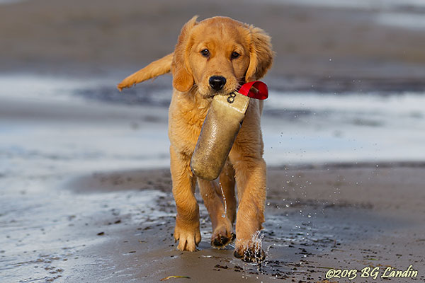 Här kommer Keepers son stolt springandes längs det som annars är sjöbotten med en dummy dinglandes ur munnen och vattnet skättande om tassarna. Om man är liten och skall hämta en dummy som ligger på vatten kan det ibland vara svårt att samtidigt få till ett bra grepp när man tar upp den ur vattnet. Då kan det hända att man får tag i kanten av dummyn och håller man bara tillräckligt fast så kommer den in ändå, även om det inte ser så väldigt praktiskt ut. Med ökad rutin kommer säkert även ett mer ändamålsenligt grepp. Vattenståndet i Mjörn är fortfarande lågt en bra bit in på hösten och den sandiga sjöbottnen blir till ett mjukt och fint underlag att springa på för valpen. Här finns fler bilder på Keepers son.