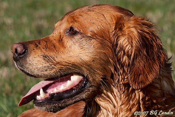 Visst är det härligt med vårträningar! Vi tränade långa markeringar och dirigeringar och Beneagle sprang, som alltid, i full fart genom vattenpölar fulla med lera, men det bekymrade honom inte det minsta. Man skulle kunna tro – och hoppas – att smutsen inte skulle fastna i den farten, men tyvärr gör den det kan jag meddela. I samband med upptaget av dummyn sprutar det lera om honom, som fastnar dekorativt i hela ansiktet på Beneagle, men han är precis lika lycklig för det. Bilden togs när jag var och tittade på SideCar några veckor innan han flyttade till Alingsås och Agneta och jag var ute och tränade. Här finns fler bilder på Beneagle.