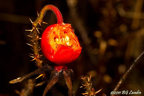 Det C-vitaminsrika nyponet är inte bara populärt bland människor utan även fåglarna är förtjusta i nyponet. Nyponen sitter kvar på busken under vintern och dom svartnar då men går fortfarande att använda. Några fåglar har mumsat på frukten och lyckats hacka sig in till själva innehållet i nyponet och det orange fruktköttet har också blottlagts. De vitgula runda fröna som då blottas är nyponets egentliga frukter och sitter alltså inuti det skyddande röda skalet. Dom vassa taggarna syns tydligt och på själva huvudstammen är dom ännu större och dessutom böjda nedåt. Bilden togs med blixt och med manuell exponering för att framhäva själva nyponet och för att dämpa ner den annars något röriga bakgrunden. Här finns fler naturbilder.