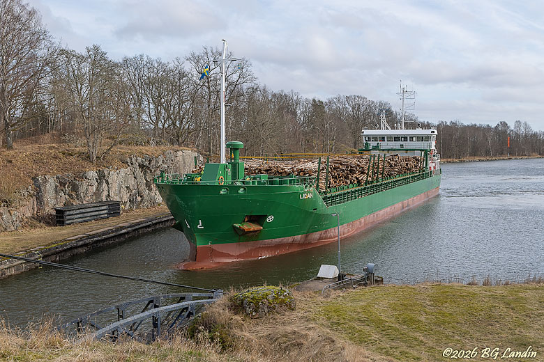 Det 89 meter långa och 13 meter breda lastfartyget Lidan är på väg in i Brinkebergskulles sluss. Fartyget går långsamt och till och från hör man hur kursen korrigeras med hjälp av bogpropellern. Den rutinerade lotsen placerar fartyget elegant i slussen trots dess generösa mått. Lidan kommer närmast från Drammen i Norge och är nu på väg med björkmassaved till pappersbruket i Grums. De senaste dagarnas milda väder har gjort att isen i kanalen smält men isbrytaren Ale är fortfarande tillgänglig och ligger för tillfället i Vänersborgs hamn. Efter slussningen i Brinkebergskulle fortsätter Lidan genom Karls grav, vidare genom vänerviken Vassbotten och passerar därefter genom Vänersborgs hamn. Strax norr om Dalbobron tar vänerlotsen över och den avgående lotsen får en välförtjänt vila. Här finns fler bilder på sjöfart.