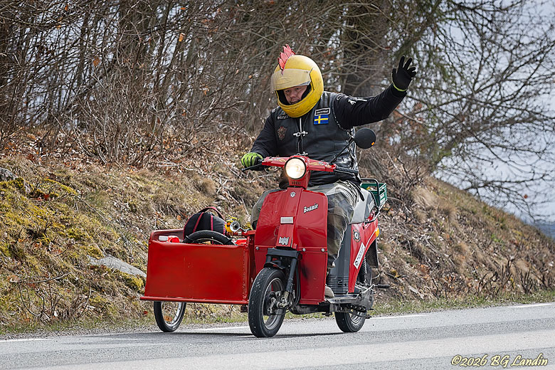 ChickenRace är ett populärt mopedrally och här startar alltid spännande ekipage. Det är inte så vanligt med sidvagn till en moped men den här föraren har ett trevligt ekipage. I sidvagnen finns både extra bensin och en ryggsäck. Sidvagnen skulle nog kunna transportera någon relativt lättviktig person eller kanske en fastspänd hund. Föraren med det röda ekipaget är på väg mot Eggvena bygdegård, som är det andra uppehållet under årets ChickenRace. Totalt fanns tre stopp längs banan och vid stoppen fanns kluriga frågor om mopeder. Tipskupongerna kunde man lämna in vid målet och de som svarat bäst hade chans till fina priser. Sedan några år tillbaka har Lions Club Alingsås tagit över som arrangör efter Alingsås Motorveteraner, som arrangerade mopedrallyt framgångsrikt under många år. Här finns fler bilder från ChickenRace 2026.