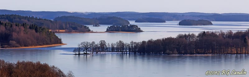 Vid Brobacka ligger isen blank på Mjörn men snön har smält under de senaste dagarnas nästan vårlika väder och överallt syns barmark. Här och där syns öppna stråk med vatten mellan istungorna på Mjörn. Rakt fram ligger Äspudden, som har översvämmats under höstens och vinterns rika nederbörd och träden längst ut på udden får sina stammar omslutna av isen. Det är ungefär en halvtimma tills solen försvinner ner under horisonten och blå timmen har precis börjat. Vid denna tidpunkt börjar de blå tonerna av ljuset bli extra påtaglig och hela bilden får en blåaktig ton. För att fånga Mjörn ur detta perspektiv måste man komma upp en upp en bra bit upp över marknivån och bilden togs ovanför grustäkten vid Brobacka. Här finns fler naturbilder.