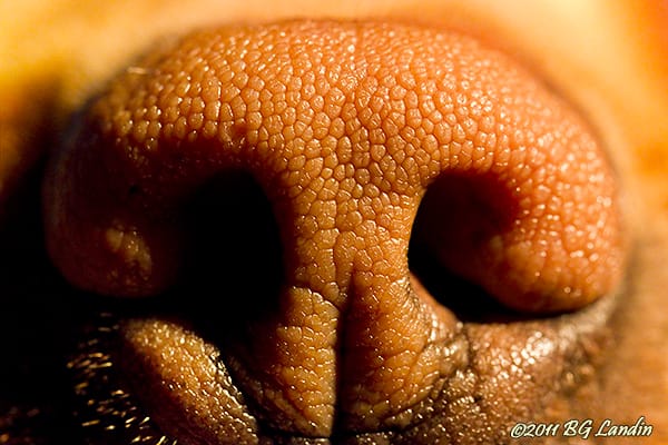 En närgången granskning av nosspegeln på Beneagle. Man kan se hur nosspegeln är uppbyggd av en mängd olika områden och man kan också se att Beneagle har skadat sig lite på nosen strax över den vänstra näsborren, skadan syns som en litet hjärtformat parti. Under den vänstra näsborren kan man också se mycket korta morrhår. Hade det varit sommar och varmt kunde bilden fungerar som hjälpmedel för att undersöka om det fanns några noskvalster men på denna bilden lyser dom otrevliga krabaterna lyckligtvis med sin frånvaro. Här finns fler bilder på Beneagle.