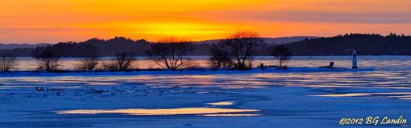 Solen har precis försvunnit ner under skogspartiet i väster men himlen har en fantastisk orange färg under ännu några minuter. Himlens intensiva färgprakt speglar sig i de snöfria partierna på Mjörns is. Så här dags på dygnet är det blå ljuset påtagligt och snön får en blåaktig ton, som står i fin kontrast mot den eldröda himlen. Det är populärt att åka skridskor på Mjörn och trots lite mildare väder med någon plusgrader under dagen verkar isen vara tillräcklig stark. Fyren längst ut på piren lyser även under vinterhalvåret men några båtar lär knappast ha någon nytta av den. Kanske en och annan skridskoåkare, som dröjts sig kvar extra länge ute på isen för att utnyttja den fina isen, kan ha navigeringshjälp av fyren för att hitta tillbaka till Alingsås. Tre separata bilder med två stegs exponeringsskillnad har lagts samman till en HDR-bild för att öka tonomfånget. Här finns fler blandade bilder.