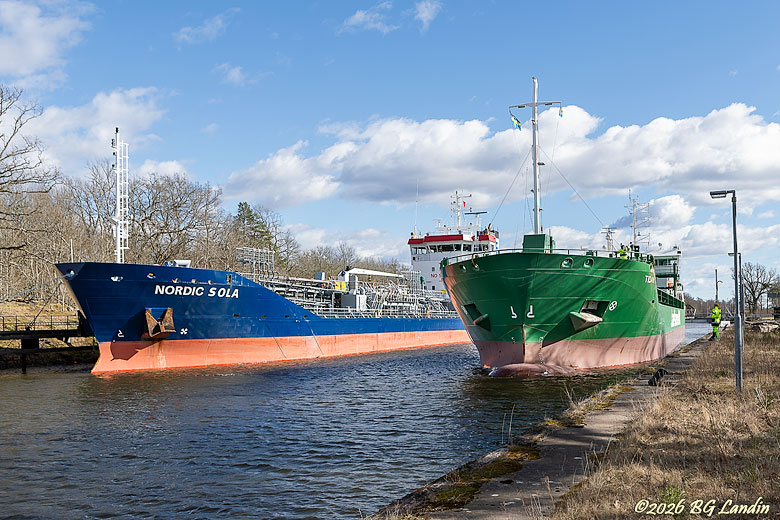 Lastfartyget Tidan anländer till Brinkebergskulle fram på eftermiddagen på annandag påsk. Tidan håller precis på att lägga till vid kajen strax norr om slussen. En besättningsman håller på att kasta över en tross och den gulklädda slussvakten är behjälplig på kajen. Kemtankern Nordic Sola har legat vid andra sidan kanalen Karls grav sedan drygt ett dygn. Det är stormen Dave som ställt till det även för sjöfarten och enligt uppgift är det problem med järnvägsbroar, som gör att fartygen får invänta tills röjning av nedfallna träd över järnvägsspår är klar. Tidan är registrerad på Färöarna och är nu på väg till Kristinehamn. I Trollhättan ligger kemtankern Oraness och avvaktar också på klartecken för att fortsätta sin färd. Sent på måndagen låg fortfarande de tre fartygen kvar vid sina kajplatser. Här finns fler bilder på sjöfart.
