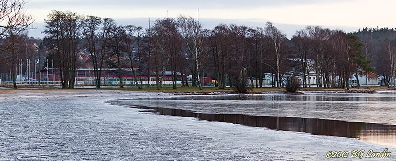 På bara ett par dagar har isen på Mjörn börjat lägga sig och det finns till och med dom som vågar åka skridsko på Tegelbruksviken. Närmast land vid Playa Mjörn ligger det sönderbruten is, som ett tydligt tecken på att vattnet i Mjörn hela tiden är i rörelse, vilket är en av förklaringarna till att det tar så pass lång tid innan isen lägger sig på Mjörn. Under eftermiddagen började himlen mulna till rejält och är nu helt täckt med moln men den nedgående solen letar sig med viss möda genom molnen och i högerkanten på bilden speglas den matta ljuset från den molnbeslöjade solen. I bakgrunden syns den öde Mjörnvallen och de röda båthusen vid Mjörn motorbåtsklubb och inte helt förvånande lyser strandgästerna med sin frånvaro. Här finns fler blandade bilder.