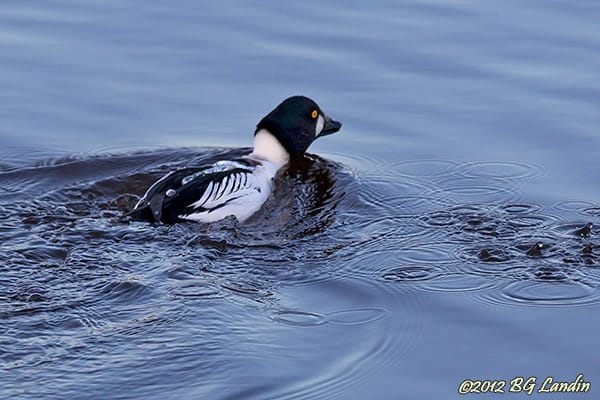 Knipan är en duktig dykare och den här knipan hade precis varit nere på botten och försett sig med något ätbart. Precis när knipan kommer upp till ytan upptäcker han en människa i närheten och sätter av i full fart så det kvarvarande vattnet far åt alla håll kanter och blir till vattenstänk runt om honom. De feta fjädrarna är kraftigt vattenavstötande och vattnet ligger fortfarande kvar på ryggen efter dyket och där bildas vattenpärlor. Knipan känns lätt igen på sitt lite toppiga huvud, som ser ut som en rundad knopp på den korta halsen. Den har ett litet trekantigt näbb och karaktäristiska stora och gula ögon. Hanen är svartare och har en vit fläck mellan näbben och ögat medans honan har grå kropp och ett brunt huvud. Här finns fler bilder på djur och natur.