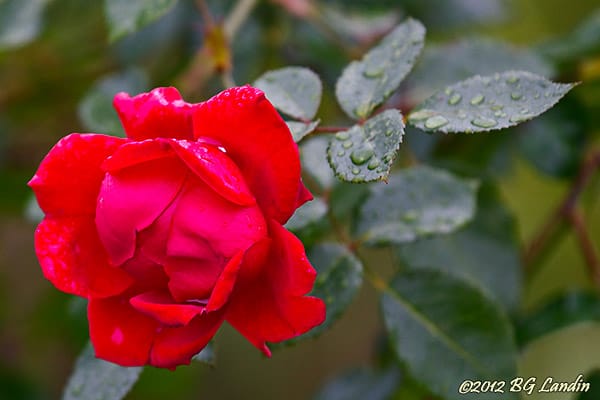Regnet hängde i luften hela dagen och även om det inte var några stora mängder nederbörd som kom så var det ändå rejält fuktigt. Det var en av de få gånger jag varit i Nolhaga koloniträdgårdar och det varit fullständigt folktomt, inte ens den mest inbitna entusiasten ansåg det vara mödan värt att ge sig dit i sådant väder och pyssla på kolonilotten. Rosorna börjar, liksom många andra blommor, börja närma sig bästföredatum men en och annan är fortfarande under utveckling till praktfull utslagen blomma. Dagens regndroppar har samlats till stora daggdroppar på rosenbladen i bakgrunden och de klarröda kronbladen bär också tydliga spår av nederbörden. Den mulna himlen ger ett mycket mjukt ljus men samtidigt blir det mörkt så här på kvällskvisten och det krävdes höga ISO-tal och lång exponeringstid för att exponera bilden korrekt men tack vare bildstabiliseringen på EF 70-200 gick det bra att använde 1/80 s. Här finns fler naturbilder.