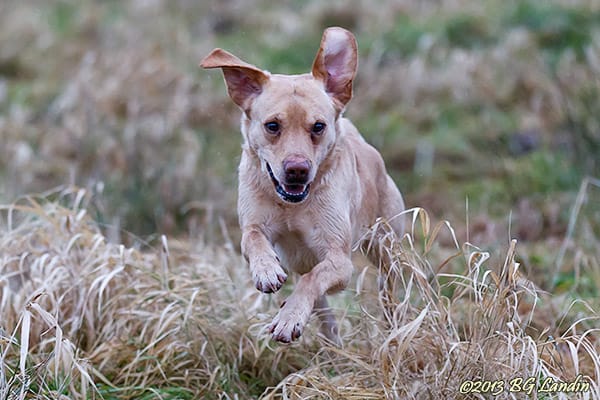 Trots ett rejält snötäcke vid jultid så försvann all snö bara några dagar senare och det nya året började snöfritt men med vattenrika marker. Hundarna trivas lika bra i snö som i slaskväder och dom älskar att springa omkring oavsett hur blöta och smutsiga dom blir. Öronen på SideCar står käckt rakt upp när han har fångats mitt i språnget av kameran i det torra gräset. Hela han utstrålar lycka över att vara ute och humöret dämpas inte på något vis över att tillfälligt bli avbruten med en inkallningssignal mitt i sina bestyr. Den helt mulna himlen sent en eftermiddag ger minimal med både skuggor och kontrast och lystern i pälsen blir väldigt dämpad. Bländare 3,2 på full brännvid ger ett mycket kort skärpedjup och lägger bakgrunden i fin oskärpa. Här finns fler bilder på Duvkullans SideCar.