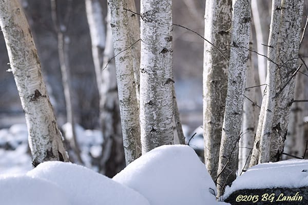 Några vita björkstammar reser sig upp bakom en snöbelagd stenmur i en svensk hage en vacker januarieftermiddag. Stammarna försöker konkurrera med snöns intensivt lysande vita färg men i detta hänseende får dom se sig klart besegrade av den snövita beläggningen på stenarna. Så här års avtecknar sig trädkronorna hos björkarna som ett trådskelett mot himlen med alla sina spretiga och avlövade grenar. Stammarna har lite skiftande grovlek och de olika björkarna befinner sig i lite olika utvecklingsstadier i sin livsprocess. Alla björkarna har samma strävan att resa sig upp mot himlen men dom är alla lite olika vinklade. Bländare 2,8 med EF 70-200 ger ett kort skärpedjup och dom björkar som står lite längre bort faller i en fin bakgrundsoskärpa. Här finns fler naturbilder.