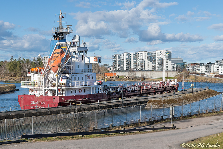 Den röda kemtankern Oraness var ett av flera fartyg som fick göra ett ofrivilligt uppehåll under annandag påsk på grund av efterdyningar efter stormen Daves framfart under påskdagen. Oraness var tidigare en flitig gäst vid Rysskranen några hundra meter längre norrut i Åkerssjö, där hon lossade bioolja till WestEnergys cisterner. Cisternerna revs nyligen och området där cisternerna tidigare stod är det nu tomt och det är oklart vad som händer med leveranserna av bioolja till Trollhättan framöver. Under onsdagen kunde fartygen som tvingats till ett tillfälligt stopp på grunda av stormen fortsätta till sina destinationer. För Oraness del innebär det att fartyget sätter kurs mot Otterbäcken på Vänerns ostkust. Det danskregistrerade fartyget är 78 meter långt och 13 meter brett. Här finns fler bilder på sjöfart.