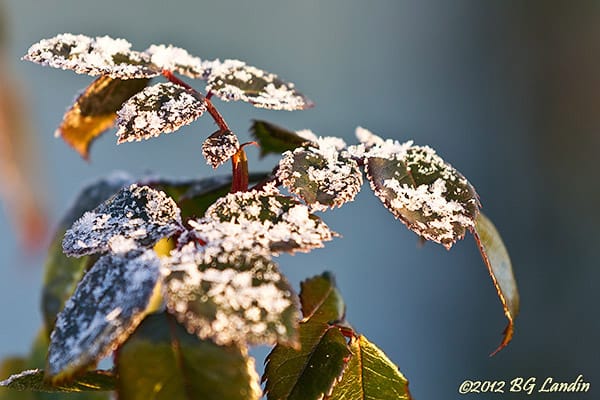 Innan snön kom på allvar för ungefär en vecka sedan var växterna bara bepudrade med snökristaller och frost. De taggiga bladen på rosenbusken är fortfarande vackert mörkgröna och har fått ett dekorativt lager med snökristaller, som verkligen ger en riktig julkänsla. Man skulle nästan tro att någon använt snö på burk och sprutat på bladen för att skapa lite extra stämning men här handlar det verkligen om äkta vara i form av ren natursnö. Bilden togs i Nolhaga koloniträdgårdar med EF 70-200 med bländare 4,0 och full brännvidd på nära håll vilket ger ett mycket kort skärpedjup. Det är bara några enstaka blad och ett begränsat antal snökristaller som hamnar i det korta skärpdjupet. Här finns fler naturbilder.
