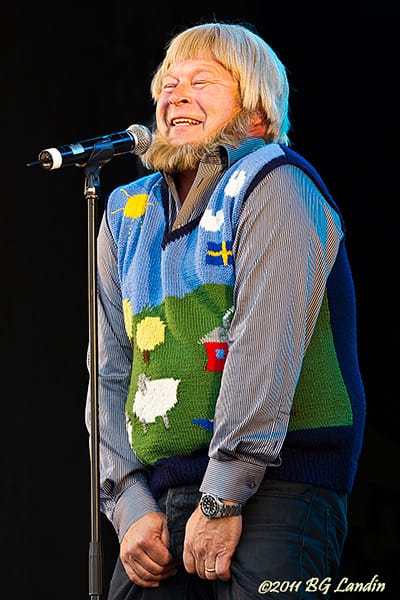 Turbo Junior, spelad av Knut Agnred, rockar loss på Stora Torget i Alingsås 110619 så det står härliga till. Turbo Jr förekom i Macken och han drömmer om att få en synth i konfirmationspresent istället för den moppe med diverse trimtillsatser, som är hans motorintresserade pappa Turbo Seniors förstahandsalternativ. På den tiden det begav sig hade Junior en svart punkfrisyr med luggen hängande över vänster öga men nu var den alltså blond, antingen har tidens tand gjort sitt eller så hade något klorberikat preparat hjälpt till. TV-serien Macken blev Galenskaparna och After Shaves stora genombrott. Macken sändes 1986 i SVT och blev en enorm succé. Låtarna från Macken blev oerhört populära och LP-skivan från Macken sålde platina. Bilden på Turbo Jr togs med befintligt ljus utan upplättningsblixt och i lätt duggregn på Potatisfestivalens sista dag 2011. Här finns fler bilder från Galenskaperna och After Shaves show på Stora Torget 110619.