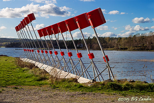 Båtbommarna står i stram givakt på bryggan, under den delen av året då dom inte ligger i vattnet. När dom ligger i det våta elementet bildar dom avgränsare mellan ”parkeringsplatserna” för båtarna. Dom röda flytkropparna, som gör att avgränsarna håller sig flytande, lyser mot den blåvita vårhimlen med sina sommarlätta moln. Det är bara en tidsfråga innan båtbommarna hamnar där dom gör bättre nytta än på bryggan och dom åter kommer i kontakt med vatten. På samma sätt är det bara en tidsfrågan innan tillhörande båtar sjösätts och tryggt ”parkerar” mellan båtbommarna. Just här har inga båtar sjösatts ännu men på många andra håll börjar småbåtshamnarna fyllas med båtar, som sjösatts av entusiastiska och förväntansfulla båtägare. Här finns fler blandade bilder.