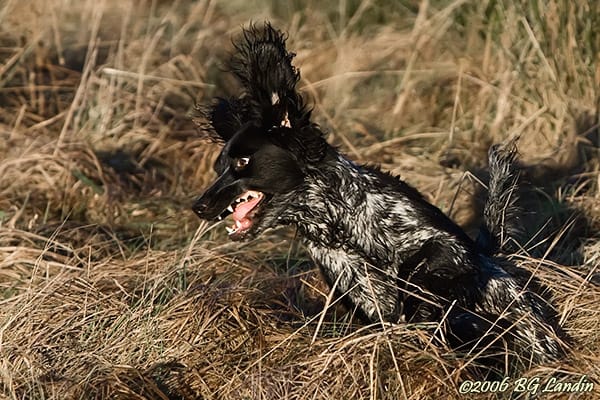 Vinden busar med håret på Jieps huvud och får håret att stå på ända och peka åt alla håll. Med en sådan frisyr framstår Jiep verkligen som den småbusig tonårsslyngel han i själva verket är. Jiep har dessutom samlat på sig delar av naturen i pälsen så han ser lite allmänt ovårdat ut hela han för tillfället. Blicken är dock stadigt riktad framåt mot den kastade dummyn, som det är meningen att han skall fokusera på för att det skall bli en profilbild. Men, det gäller att inte röra sig för mycket som fotograf för då flyttas blicken och fokus blixtsnabbt åt ett annat håll och bilden blir inte som man tänkt sig. Bländare 3,5 på brännvidden 200 mm ger en total oskärpa åt en annars lite orolig bakgrunden. Här finns fler bilder på Jiep.