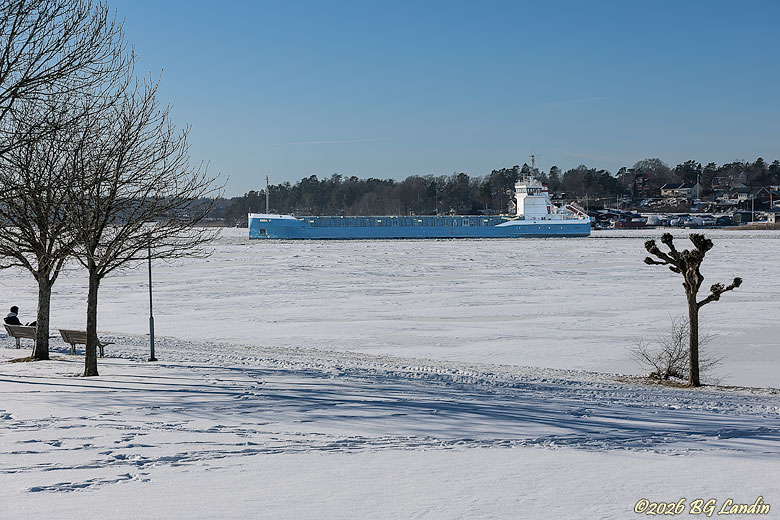 Lastfartyget Emma F har legat stilla i vänerviken Vassbotten under nästan en hel dag. Fartyget ligger bara några hundra meter från järnvägsbron vid inloppet till Vänersborgs hamn. Den isbrytande bogserbåten Bob har tagit sig upp genom Göta älv under dagen och assisterar kemtankern Nordic Sira fram till Vänersborgs hamn. Där tar statsisbrytaren Ale över isbrytningen på Vänern och Bob vänder tillbaka och assisterar Emma F söderut genom Trollhätte kanal och Göta älv. Emma F är 87,99 meter lång och 13,03 meter bred och hör hemma i exotiska Antigua och Barbuda i Västindien. Fartyget borde vara van vid betydligt varmare klimat och kan säkert känna sig lite malplacerad i den nordiska vintern. Här finns fler bilder på sjöfart.