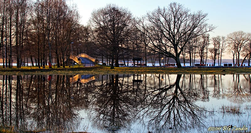 Solen håller på att gå ner över Östad och solljuset lyckas tillfälligt spränga sig fram genom den annars ganska dystra januarihimlen. 2012 har vädermässigt inte inletts på ett sätt som gör att man får gjädjefnatt av det vackra vädret och man riskerar så här långt inte heller någon överdos av naturlig ljusterapi. I förgrunden syns några granar som står högt ovanför grustäkten vid Brobacka och alldeles framför den lätt krusiga vattenytan på Mjörn sträcker väg 190 ut sig i riktning mot Gråbo och Göteborgs nordöstra förorter. Bilden består ursprungligen av tre separata bilder med två stegs exponeringsskillnad mellan varje bild, som lagt samman till en HDR-bild i Photomatix och sedan har filtret Högdagrar och Skuggor i Photoshop använts för att ytterligare plocka fram detaljer, främst i förgrunden. Här finns fler naturbilder.