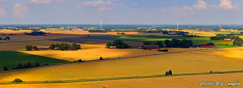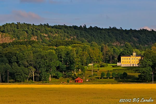 Hunnebergs branta bergsmassiv reser sig i väster mot augustihimlen. Hunneberg är mycket skogbevuxet med många sjöar och tjärnar men längs området mellan berget och Göta älv finns bördig jordbruksmark. De gula sädesfälten, som delvis är solbelysta genom luckorna i molnen, är nästan mogna att skördas. Framför bergsmassivet ligger den gula mangårdsbyggnaden på Nygårds egendom och man kan också skymta några mindre byggnader. Letar man bakom gården så kan man hitta Nygårds trappor och den vägen ta sig uppför Hunneberg. Trapporna är gjorda i ek och har anlagts för att underlätta för vandrare att få tillgång till berget. Bilden är en HDR-bild skapad i Photomatix, som har sitt ursprung i tre separata exponeringar med två stegs exponeringsskillnad. Här finns fler blandade bilder.