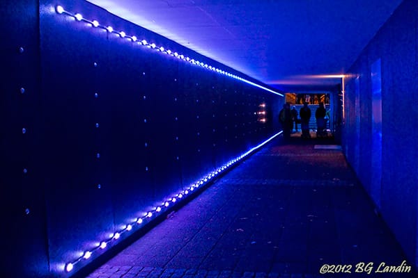 Lights in Alingsås är inne på sin fjortonde säsong och den andra dagen har tyvärr präglats av nederbörd, som så många dagar förut den senaste tiden. Tanken var annars att ta en tur runt de ljussatta objekten och ta några nya bilder men det får anstå tills regnet behagar upphöra. Bilden togs på premiärdagen och visar tunneln under järnvägen, från järnvägsstationen till Järnvägsgatan. En mängd blå lampor lyser upp tunneln och ger ett ganska kallt ljust men samtidigt lyser ett antal gula lampor upp i ett slumpmässigt mönster och bidrar till både puls och värme. Man kan se dom gula lamporna borterst i tunneln och på vänster sida alldeles bredvid personerna i tunneln. Här finns fler bilder från Lights in Alingsås 2012.