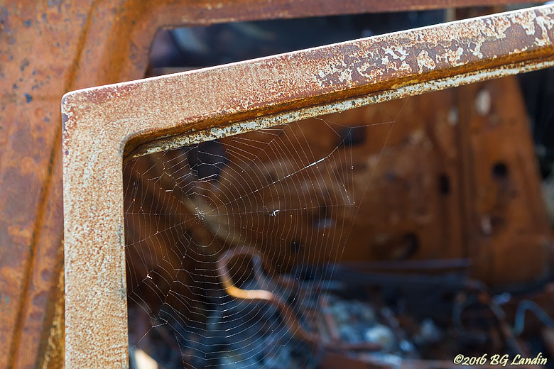 På en övergiven gård väster om Mjörn finns ett boningshus och det som en gång har varit flera ekonomibyggnader. Av ekonomibyggnaderna återstår idag bara betonggrunderna. Några bilvrak har också fått sin sista hemvist på den övergivna gården. Någon har inte kunna låta bli att tända eld på en av bilarna och all inredning har brunnit upp. En del aluminiumdetaljer har också smält i värmen från branden. Branden har också bränt bort lacken nästan överallt och därmed påskyndat rostens utbredning. Man kan dock fortfarande se en del av den vita lacken på en av framdörrarna där elden inte fått tillräckligt fäste. En spindel har passat på att gillrat sin fälla och spunnet ett spindelnät i det övre vänstra hörnet i höger framdörr. Här finns fler bilder på övergivna föremål och platser.
