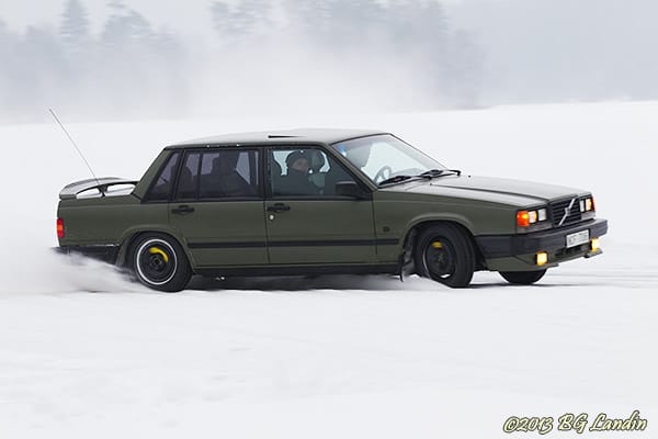 Fina isar lockar fram hästkraftsstinna bilar ur sina garage. Det är kanske inte alla gånger bilar som vinner stora skönhetstävlingar, men vad spelar det för roll när motorerna ger ifrån sig ljuvliga toner, som kan konkurrera med vilken skönsjungande tenor som helst. Den här koboltblå 245:an har en härlig sättning på fjädringen, med en mycket låg bakfjädring kombinerat med en uppkäftigt hög framfjädring och till det alldeles makalösa hjulvinklar fram, som gör att hjulen nertill pekar rejält utåt. Negativ camber, som det kallas, ger bättre grepp och maximerar kontaktytan mot underlaget vid kurvtagning, för ytterdäcket. Det går undan något så hejdlöst när den välpreparerade motorns alla ystra hästar tyglas skickligt på Myrsjöns hala is. Här finns fler bilder från iskörningen på Myresjön 130127.