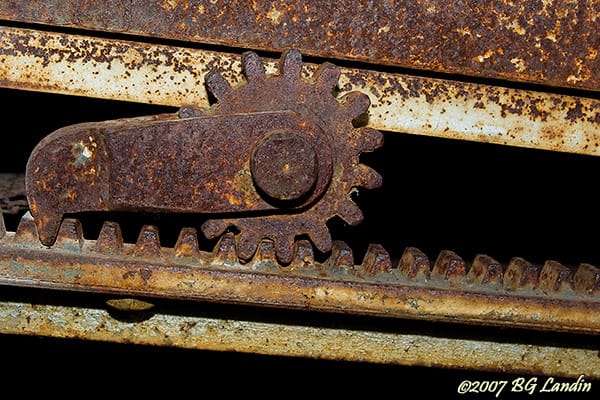 Sverige har länge varit känt för sin glastillverkning och många är dom svenska glasbruk som blivit kända långt utanför Sveriges gränser. Tyvärr har mycket av svenskt glas fått stryka på foten till förmån för billigt massproducerat glas från lågprisländer och än i dag så läggs flera kända glasbruk ner. Fåglaviks glasbruk låg strategiskt längs västra stambanan och var länge ett blomstrande glasbruk i Västra Götaland med som mest trehundra anställda under sin storhetstid men produktionen lades ner helt i början av 1980-talet. Därefter stod det gamla anrika glasbruket och förföll under mer än 25 år innan man efter stor beslutsvånda slutligen kom fram till att enda lösningen var att jämna hela byggnaden med marken, vilket också genomfördes 5-18 september 2007. På bilden syns en del från en av de maskiner som fanns kvar i glasbruket ända fram till rivningen. Det är en stoppmekanism med ett kugghjul, en kuggstång och en stopparm till ett löpande metallband för transport och avsvalning av nytillverkade glasprodukter. Här finns fler bilder från Fåglaviks glasbruk.