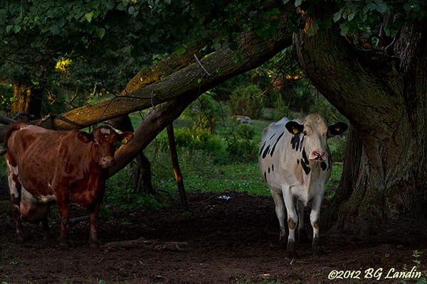 I en typisk småländsk hage hittar man förutom massor av sten också dessa båda kossor. I hagen finns ytterligare ett tjugotal kossor som fridfullt vandrar omkring och betar. Solen håller på att gå ner och ger ett varmt och nästan gyllene skimmer åt lövverket i bakgrunden. Kossorna har en mängd färgteckningar och just de här två kompletterar varandra fint. Båda två har för tillfället valt att stå i skuggan av dom stora grenarna och det sommargröna lövverket från den gamla linden i beteshagen. Den rödbruna kon i vänsterkanten kommer att inom bara några dagar tillföra ytterligare en liten fyrbent krabat till de övriga i flocken. Här finns fler bilder på djur och natur.