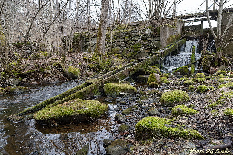 En smal mossbevuxen vattenränna leder från den högre vattennivån i Ålandasjön till intaget där turbinen sitter på Ålanda kvarn. Mossan trivs fint här i den fuktiga och skuggiga miljön och både vattenrännan och stenarna i forsen har begåvats med vacker grön mossa. Vattenrännan har nog tillkommit senare och har knappast använts till att driva den tunga vattenturbinen, som än i dag sitter på sin plats men har rostat. Förmodligen har hela vattenflödet från dammluckan använts till att driva turbinen. Kvarnen använde ursprungligen kraften i det framrusande vattnet för att driva kvarnen men elektrifierades i mitten av 1960-talet då en fiskodling tog så mycket vatten i anspråk att vattenflödet inte längre räckte till. Verksamheten i kvarnen upphörde 1987 men kvarnen är förhållandevis välbevarad. Här finns fler blandade bilder.