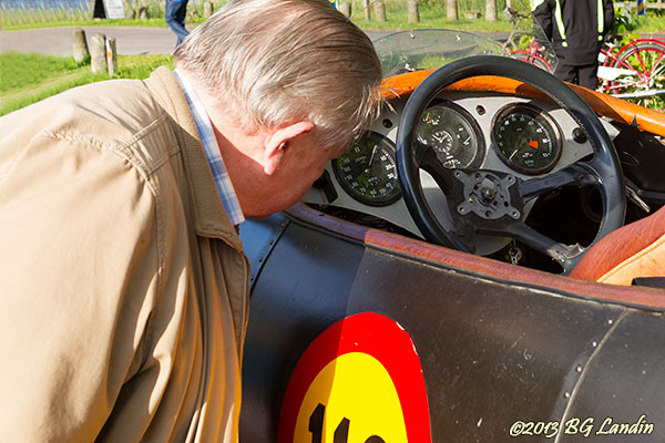 En vacker och stilren lättviktare med en härligt röd ram står lutad mot ett av dom väldiga träden i slottsallén vid Näs. Den kromade tanken glänser vackert i kvällssolens låga strålar och den röda färgen står i fin kontrast till sommargrönskan. Vid bilträffarna vid Näs samlas både bilar och motorcyklar i varierande åldrar. Dom flesta är renoverade till ett fullständigt makalöst skick och dom används av sina ägare under sommarhalvåret för att bl.a. åka till olika träffar. Lättviktaren har en motor från Sachs och har två separata kedjor för motor respektive trampor. Tramporna används vid start och kan även användas som extra effekttillskott från föraren vid uppförsbackar. Här finns fler bilder från bilträffarna vid Näs 2013.