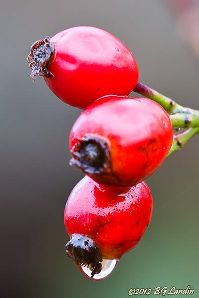 Den jämngrå novemberhimlen ger ett mjukt ljus och ger i stort sett inte upphov till några skuggor alls och det blir ett kontrastlöst ljus. Det väldiga himlavalvet utgör en gigantisk softbox med solen bakom den grå molnen som ljuskälla och molnen som en gigantisk diffusor. De röda nyponen ser nästan glaserade ut men det är det fuktiga vädret som skapat en vattenhinna över nyponen. Under det nedersta nyponet hänger en stor vattendroppe och nyponens röda färg återspeglas i det allra yttersta vattenskiktet på vattendroppen. Nyponbusken har några riktigt elaka taggar på stammen, som kan riva sönder det kraftigaste tyget. De röda nyponen är egentligen så kallade skenfrukter och de egentliga frukterna är små borstformiga, stenhårda nötter som sitter inuti skenfrukterna. De köttiga väggarna hos nyponen kan torkas och kan användas till nyponsoppa och örtte. I toppen på varje skenfrukt finns en öppning, den så kallade stiftkanalen. Den kallas så därför att stiften från varje fruktämne sticker ut där. EF 70-200 på nära håll och full brännvidd samt med bländare 5,0 ger ett mycket kort skärpedjup samt en härligt krämig bakgrund. Här finns fler naturbilder.
